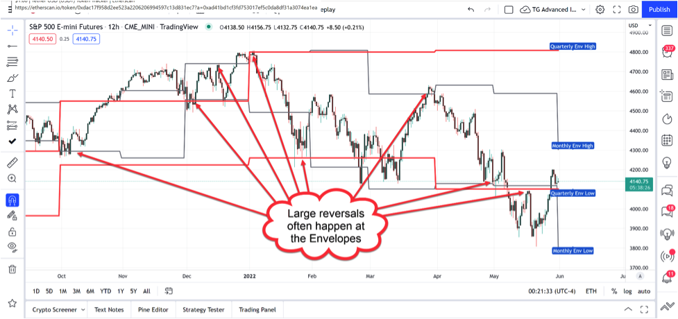The Envelopes indicator plots the Daily, Weekly, Monthly and Quarterly envelopes right on the chart with labels. Envelopes are the prior Low and Prior High of the different periods. It is extremely helpful, if not necessary to know where these powerful levels are. Often they will act like a magnet for price, as well as be a pivotal area where price will reverse at. So use them for targets or support and resistance levels. Many traders forget where these levels are and lose the reference points. This indicator does the work for you so you don’t have to worry about marking off these levels day to day, week to week. You’ll wonder how you traded without them!