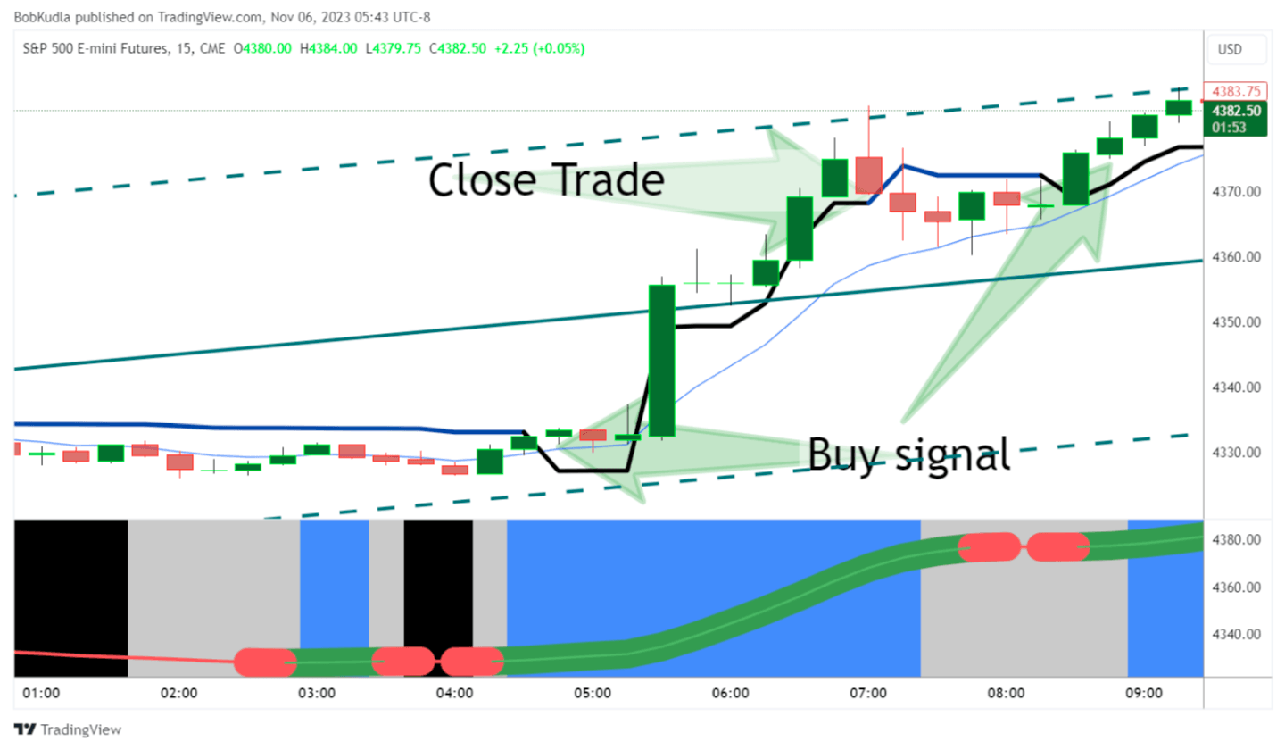 The signal works in two parts, the first part tells you if we are in an uptrend, consolidation or a downtrend. The second tells you if the momentum is a buy or sell. When in agreement with each other, it gives you a powerful trading tool. We created a third dynamic using the Volatility stop to provide an ability to have further confirmation, but more importantly to use as an exit signal when in a trade. In other words let your winners run, and kill you losses fast.